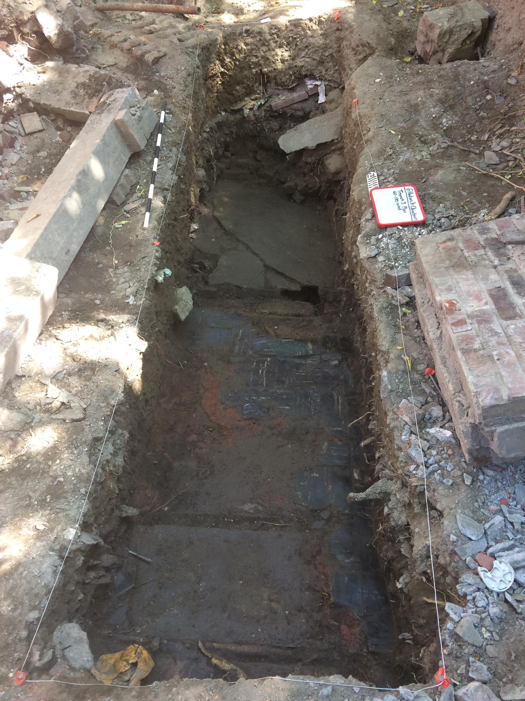 Excavations extended down nearly six feet through dense demolition debris and fill. The team recovered artifacts from residents of the property in the 1970s and 1980s.  At six feet down, they reached the floor of an addition on the back of 6 Hudson street. Below this floor was an older brick floor that likely was the original yard of the house in the late 1800s.