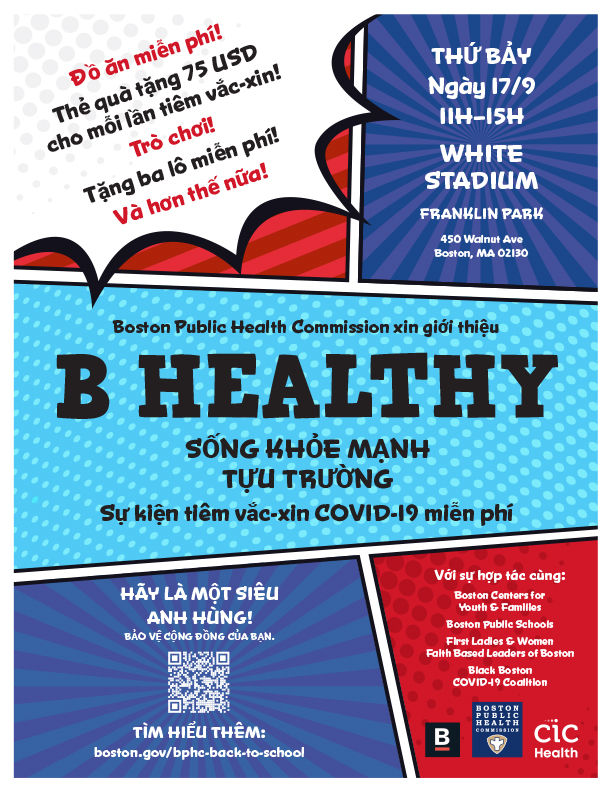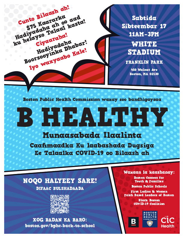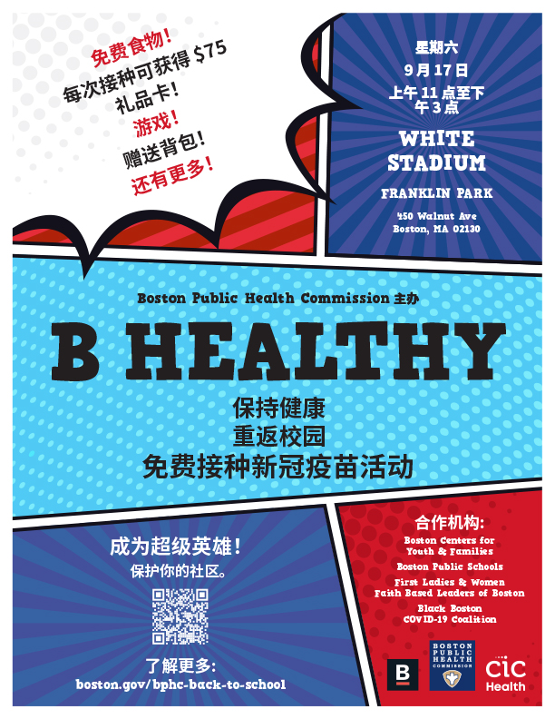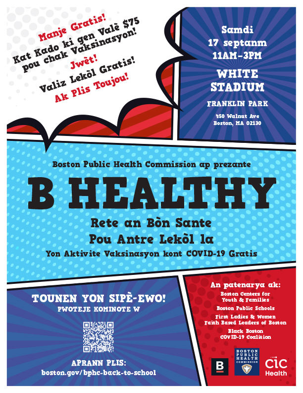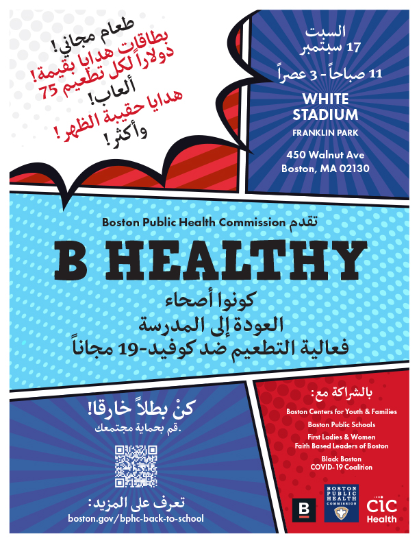 This event is hosted by the Boston Public Health Commission (BPHC), in partnership with Boston Public Schools, Boston Centers for Youth & Families (BCYF), CIC Health, Black Boston COVID-19 Coalition and The First Ladies and Women Faith Based Leaders of Boston. With thanks to our sponsors: Boston Athletic Association, Boston Bruins Organization, Reach out and Read Northeast Region, Stop & Shop, and Vertex Pharmaceuticals, Inc.