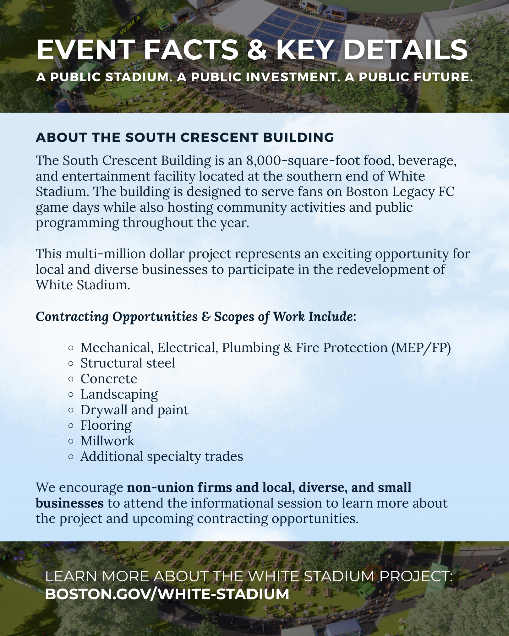 At this information session, you’ll hear directly from the White Stadium project team about upcoming bid opportunities and how your business can participate in building the future of White Stadium. For more information view the event flier here