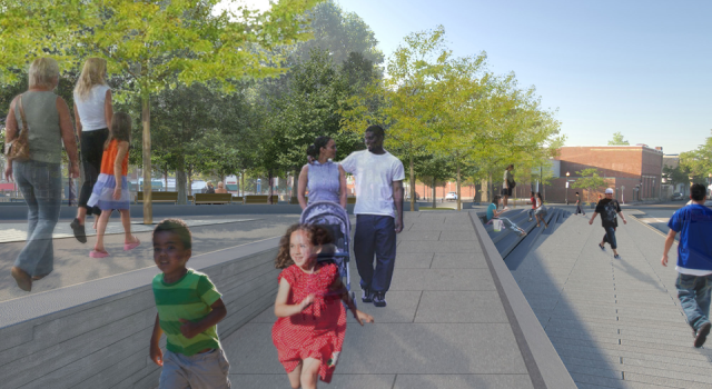 Laid out in the days of horse and carriage, the square includes vast expanses of pavement and an oval park in the center that is difficult to access.