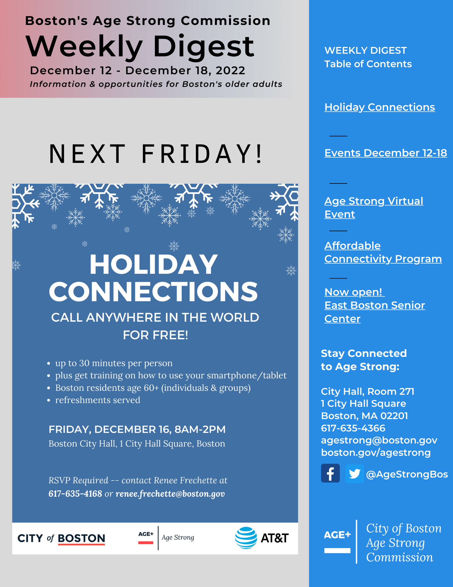 Stay in touch with the Age Strong Commission! In our monthly to-do, we share events for older adults in the City of Boston, organized by date and neighborhood!