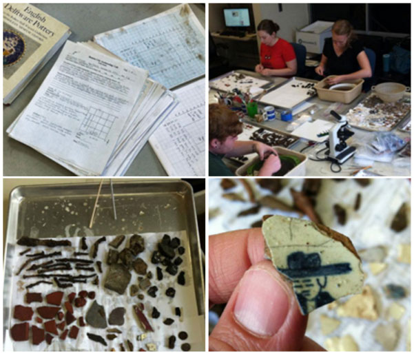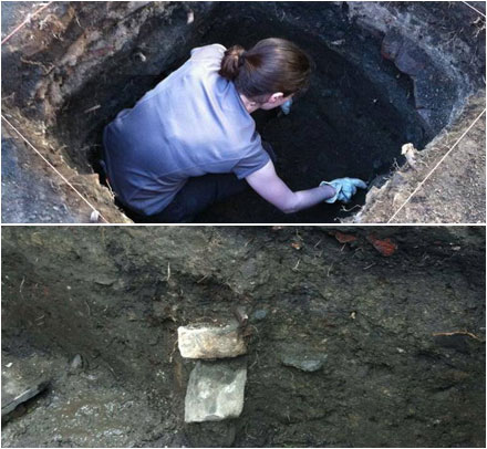 Volunteers (left) began digging in the rear lot of the Clough House on May 16, 2013. Studying the stratification of soil helps to identify the context and date of many artifacts.