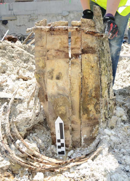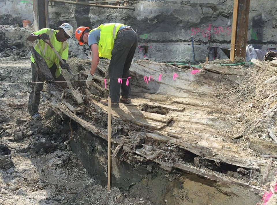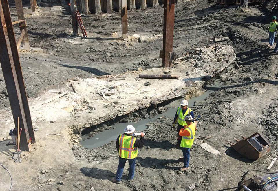 During initial construction work at the site, dozens of massive H-piles (steel beams) were driven into the fill prior to it being excavated. This resulted in two piles unknowingly impacting the shipwreck well before excavations reached it. Excavation crews removing the fill with heavy machinery found the wooden hull of the ship and stopped excavations.