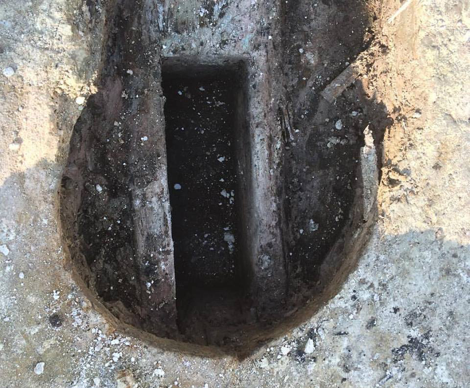 Mast step in hull (outer circle) and keel (inner rectangle) where the ship mast sat. (Image Credit: City of Boston Archaeology Program)