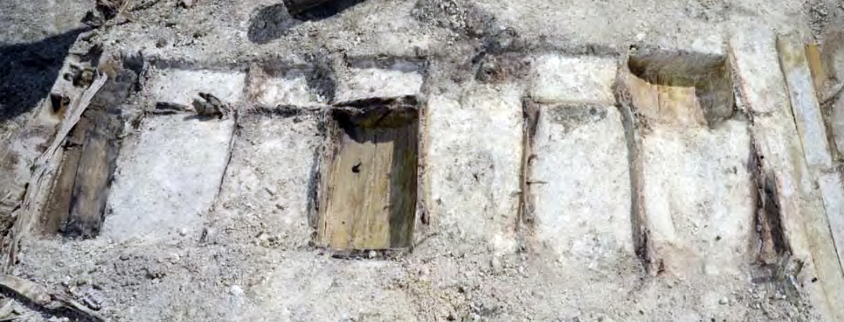 Lower portions of partially burned lime barrels. One barrel excavated to show wood staves. (Image credit: Public Archaeology Laboratory, Inc. )