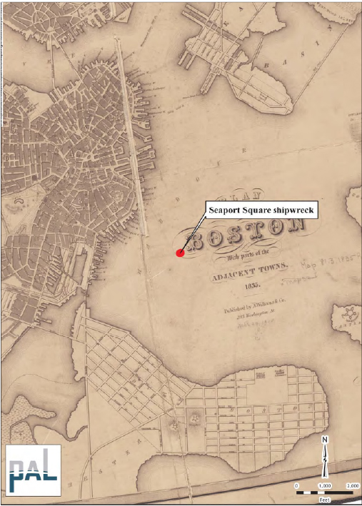 Until it was filled beginning in 1885, the site of the Seaport Shipwreck was part of the expansive South Boston Flats, a tidal mudflat that would have been dry at low tide and submerged at high tide. Much of the land that today makes up the Seaport district of South Boston was filled in the 19th century. The Seaport Shipwreck was found under 20 feet of fill resting directly on clay in what used to be the harbor's seabed.