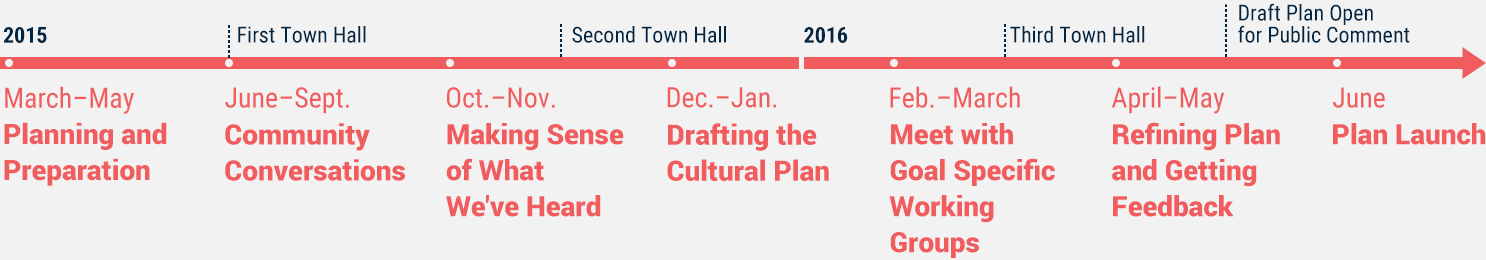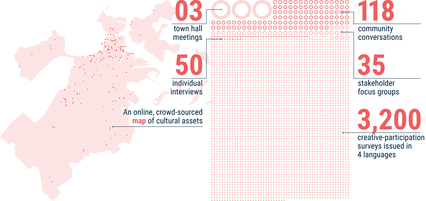 Boston Creates undertook an extensive community engagement process that opened with a town hall meeting on June 2, 2015 and ended on October 15, 2015 with the close of a citywide online survey.