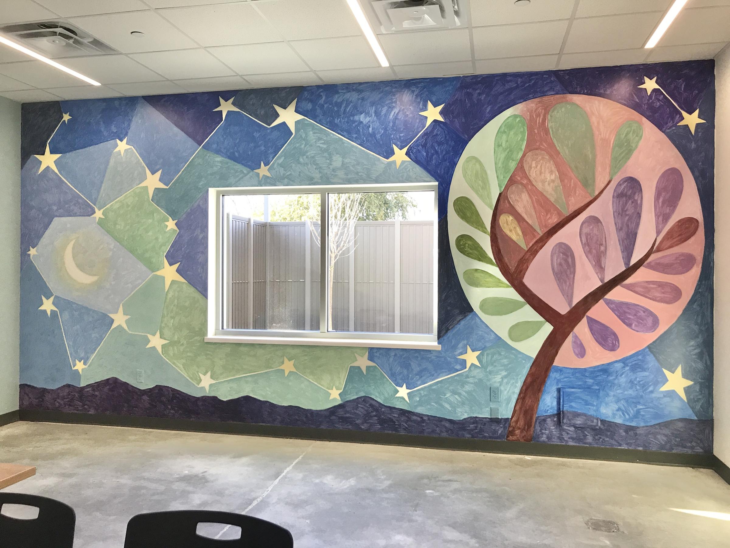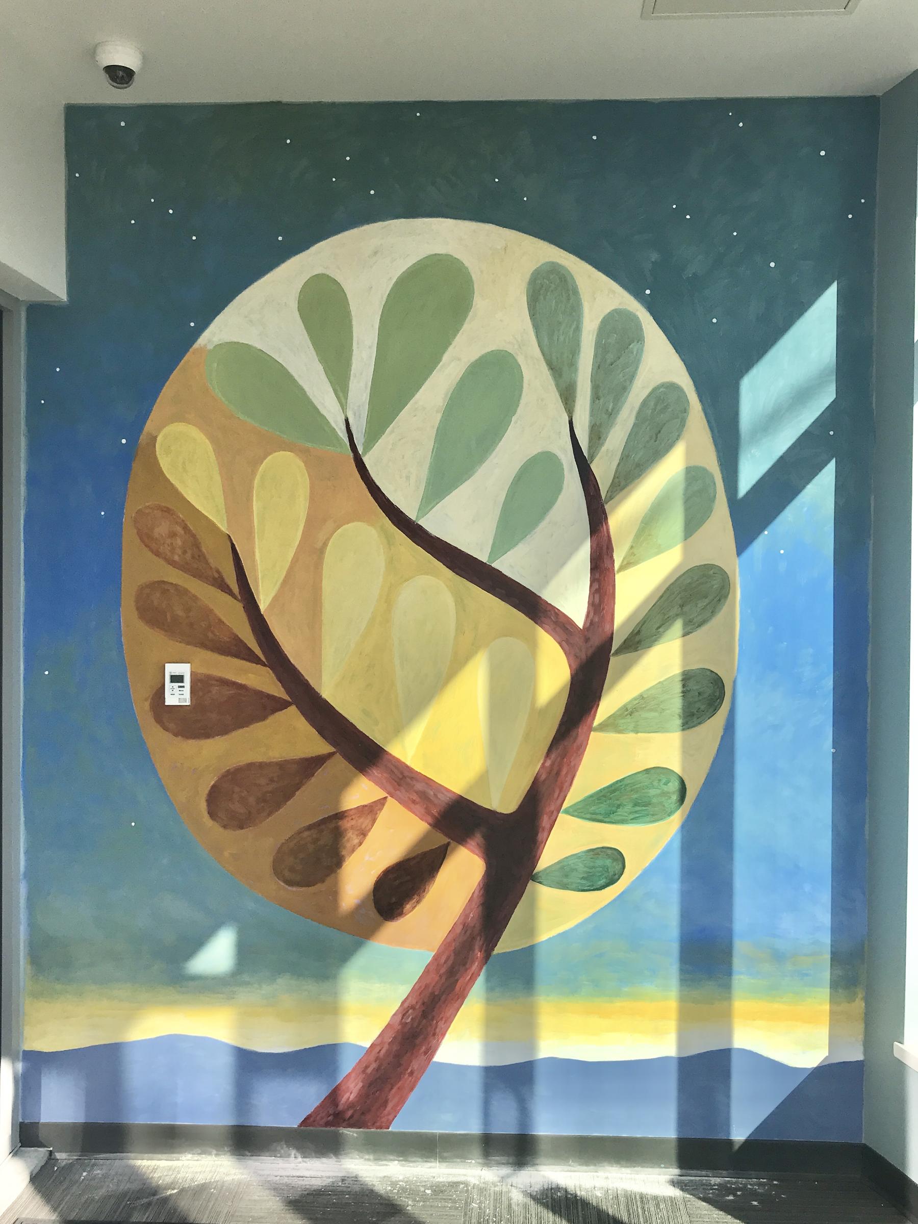 • "Tree of Life" is sited in the entrance hall of the building. It measures 7 feet wide by 9 feet high. A simple, life-affirming tree of life image greets all who enter through the front door. The tree is set in a dawn landscape with quiet starry sky above. It calls to mind new beginnings and a sense of calm much larger than the drama of any individual human story.