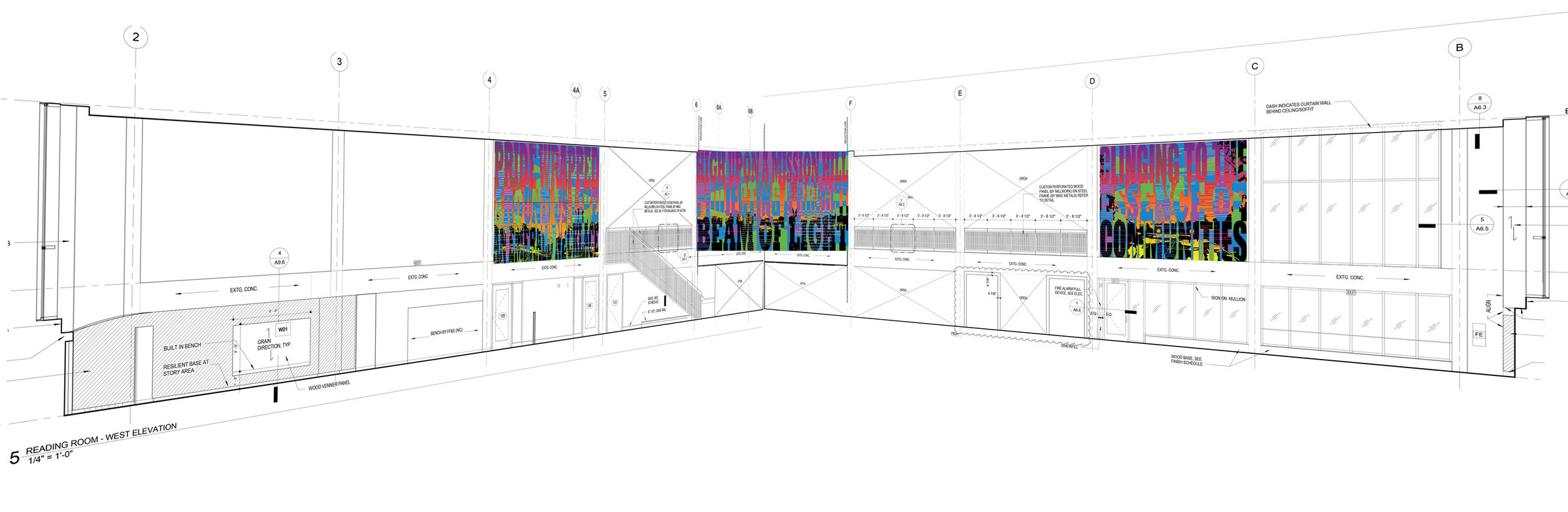 The second layer is an abstract layer. It responds to the architectural elements of both the original and redesigned branch. A color spectrum of gradient throughout the piece will mirror the gradient across the back of the library stacks. The wood diagonal baffles throughout the ceiling show up in the abstract design. The vertical columns of the space are also reflected in the vertical “bands” in the design.