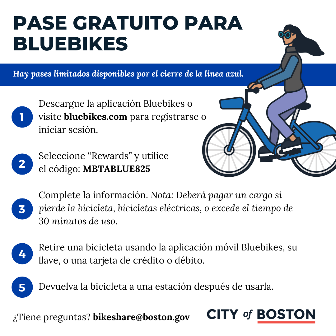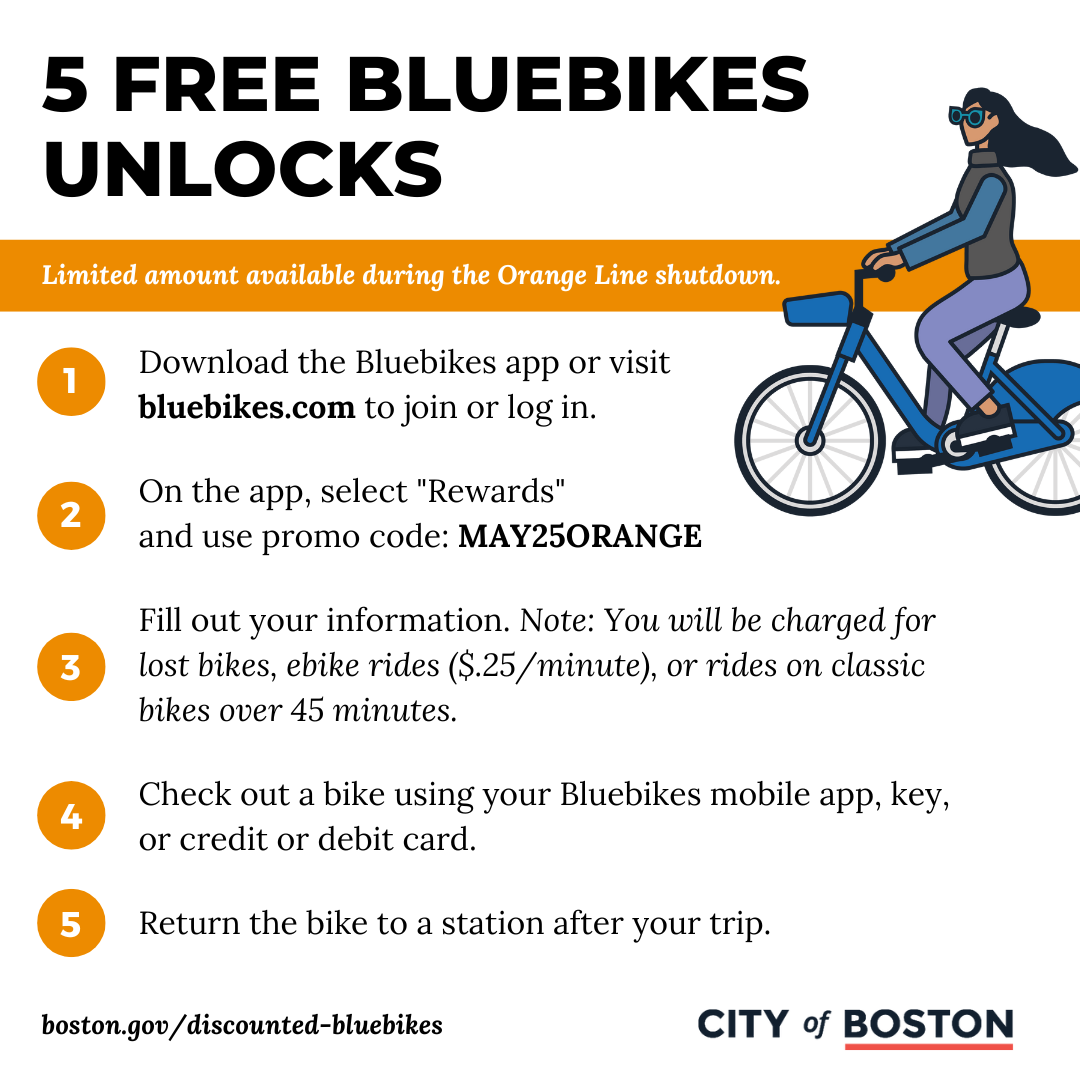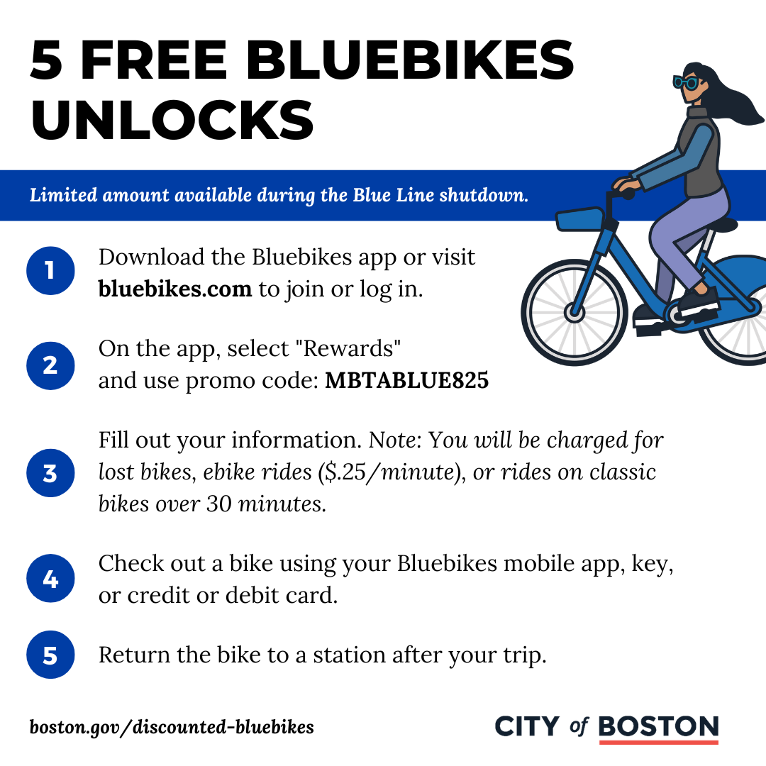 During the Green Line shutdown from December 8-22, the City of Boston is offering five free Bluebikes unlocks, while supplies last. Note: you will be charged for lost bikes, ebike rides ($.25/minute), and rides on classic bikes over 30 minutes ($.25/minute). Use code MBTAGREEN128 during the closure. More information can be found on the City of Boston's MBTA Diversions page.