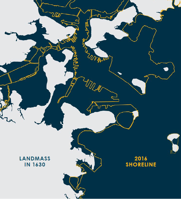 The history of landmaking is part of what makes Boston so vulnerable to sea level rise and coastal flooding. As early at 1722, colonists started to change the natural outline of Boston by using landfill to create new space for shipping facilities, rail infrastructure, development. and more. By the turn of the 19th century, Boston’s landfilling project had changed the shape of the coastline almost in its entirety. Neighborhoods like the Back Bay, Seaport, Logan Airport, and even sections of downtown are all part of this filled-in territory.