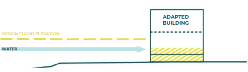 - Building Adaptation: Building adaptation measures occur at the building or site scale. These can include elevating the structure, utilizing deployable perimeter or entrance flood barriers, filling in basements, and using wet or dry flood-proofing. The Coastal Flood Resilience Design Guidelines include guidance for how to adapt different types of buildings that are found in Boston.