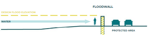- Floodwalls / Seawalls: Floodwalls/seawalls are specially engineered walls made of concrete, steel sheet piles, or other materials designed to prevent flooding. These are usually used in locations where space is very limited and other options cannot be implemented due to existing buildings and other infrastructure that are close to the waterfront.