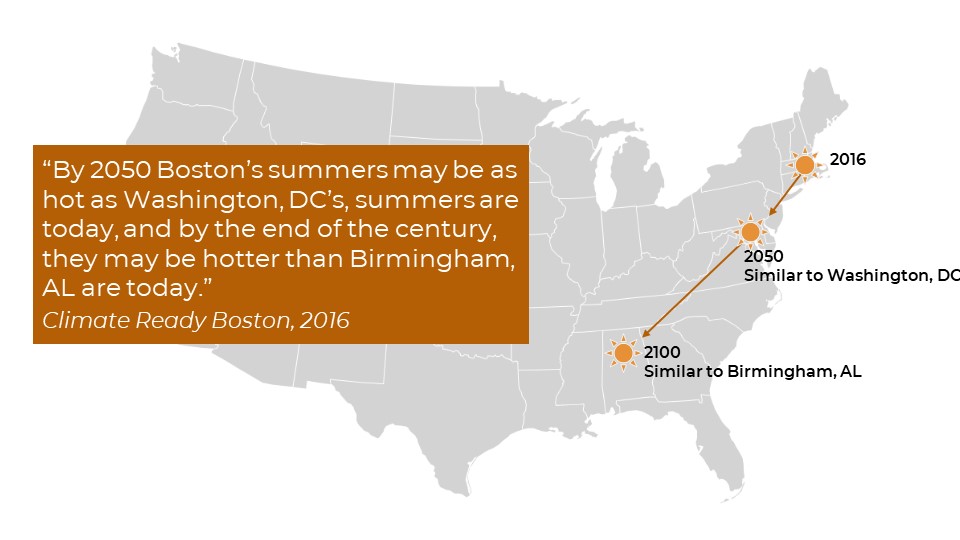 How much Boston’s temperatures continue to increase will depend on how quickly and by how much global greenhouse gas emissions can be reduced. Even a small increase in average temperatures will lead to more frequent very hot days and nights, along with longer and hotter heat waves.