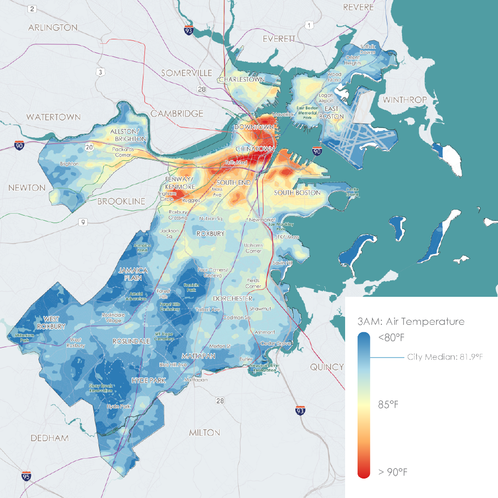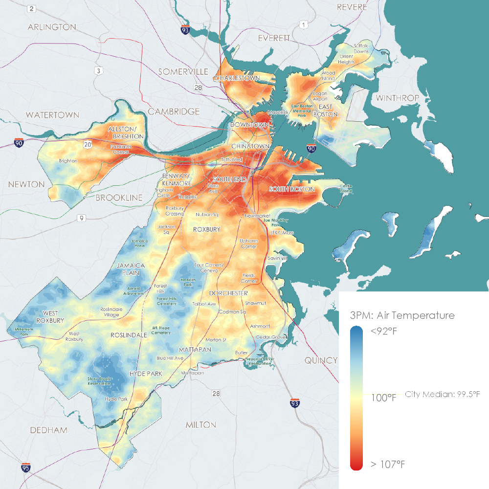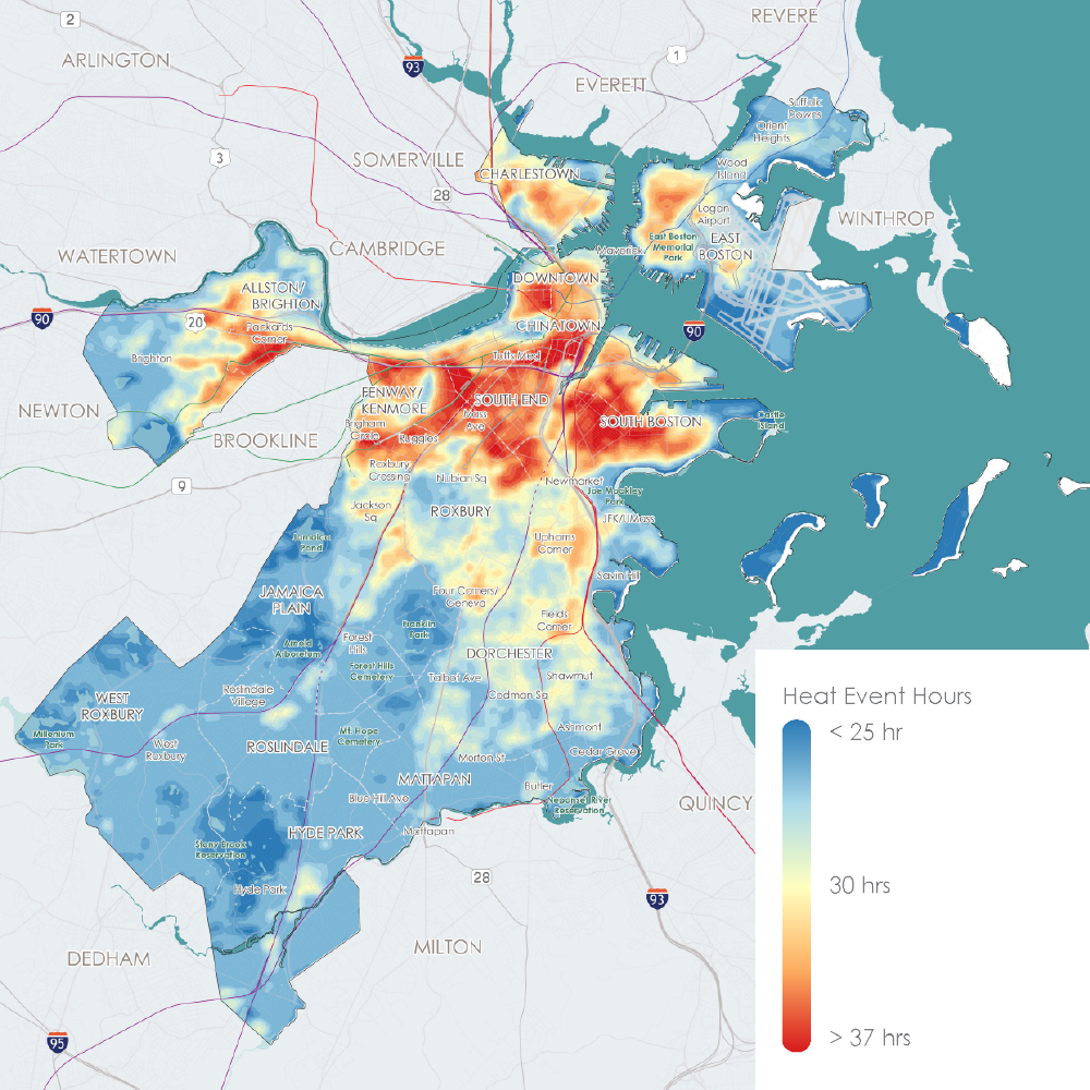 Some areas of Boston are hotter than the rest of the city, entering high-heat conditions sooner, reaching higher air temperatures, and remaining in heat wave conditions longer.