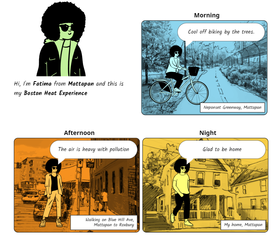 The Heat Resilience Story Comic Builder is a web-based community engagement tool developed for the plan to cultivate empathy through storytelling. Using the Comic Builder, participants can build a personal avatar and design three scenes that reflect their heat experience. Heat stories were compiled into a virtual flip book for participants to read each other’s stories and see the variety of heat experiences.