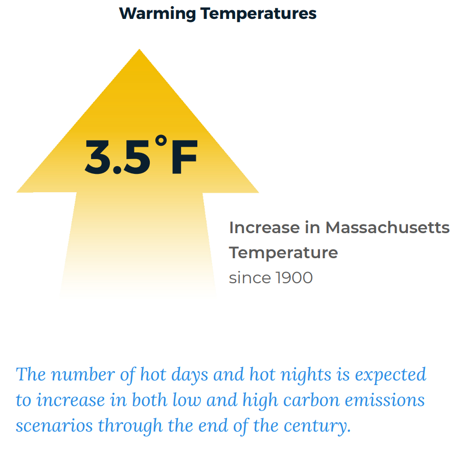 In Massachusetts, we have already seen average temperatures increase by almost 3.5°F. Over the last decade, Boston experienced more hot days and nights than any decade in the previous 50 years.