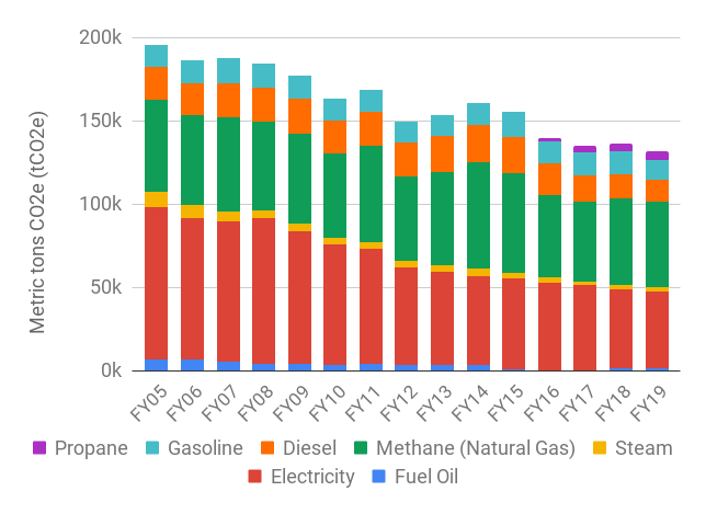 Similar to the community-wide inventory, Boston’s municipal operations GHG inventory trends are driven by a number of external and internal factors. Diesel consumption is continuing to decrease as Boston Public Schools switches its fleets from diesel- to propane-powered school buses. The continued downward trend in the regional electric grid emissions rate also contributed to reduced emissions.