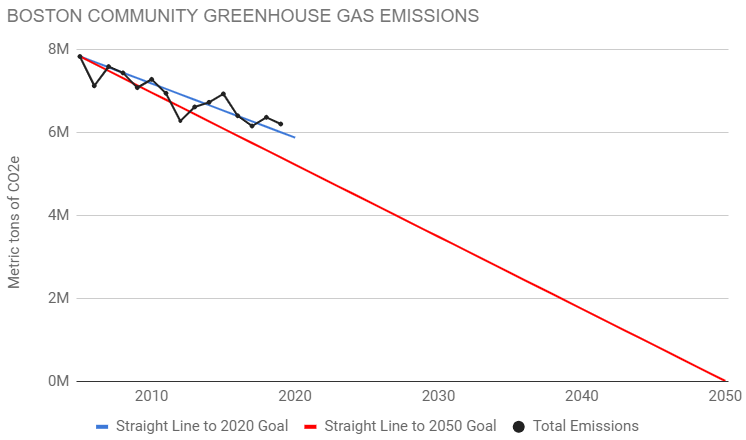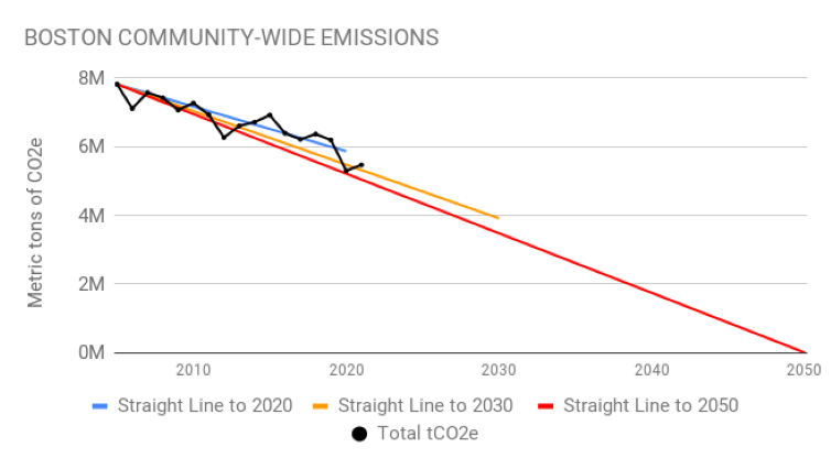Community emissionsMayor Michelle Wu has committed to achieving a Green New Deal for Boston, by tackling the climate crisis with strategies that address economic, social, and racial inequities. Eliminating greenhouse gas emissions that drive climate change is core to the vision, along with building resilience to a changing climate, and underpin Boston’s Climate Action Plan. To measure progress, Boston follows the Global Protocol for Community-Scale Greenhouse Gas Emission Inventories (GPC). The baseline year is 2005, the first year in which consistent and reliable data was collected. Boston has a goal to achieve a 50% reduction by 2030 and net-zero greenhouse gas emissions by 2050.