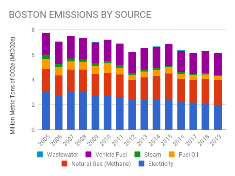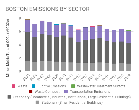 - Energy used by buildings and other stationary sources; fugitive emissions from methane distribution within Boston limits.