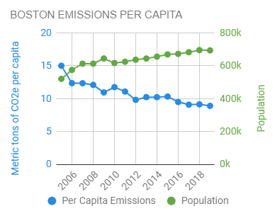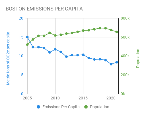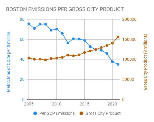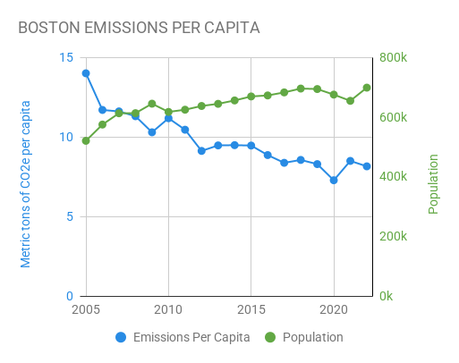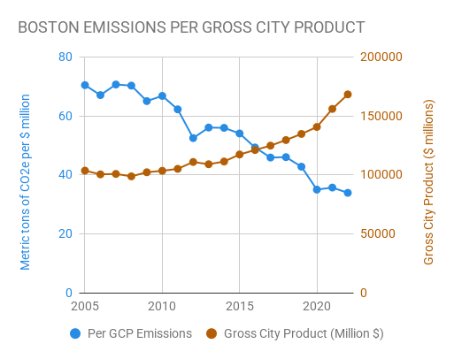 The increase from 2021 Boston’s emissions occurred alongside population and economic growth in the city. The Boston community has grown from 521 thousand residents in 2005 to 699 thousand residents in 2022. Emissions per resident over the same time period have decreased 42%, from 14 to 8 metric tons per year. Boston's economic growth, as measured by Gross City Product (GCP), has increased from 103 billion dollars to 175 billion. Emissions per million dollars of GCP have decreased 51%, from 70 to 34 metric tons per million dollars.