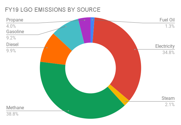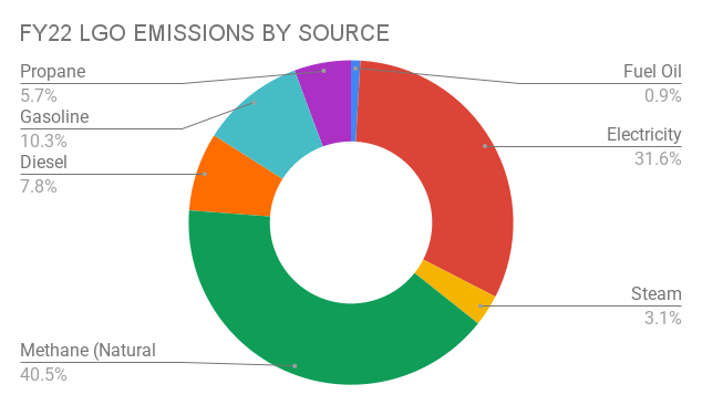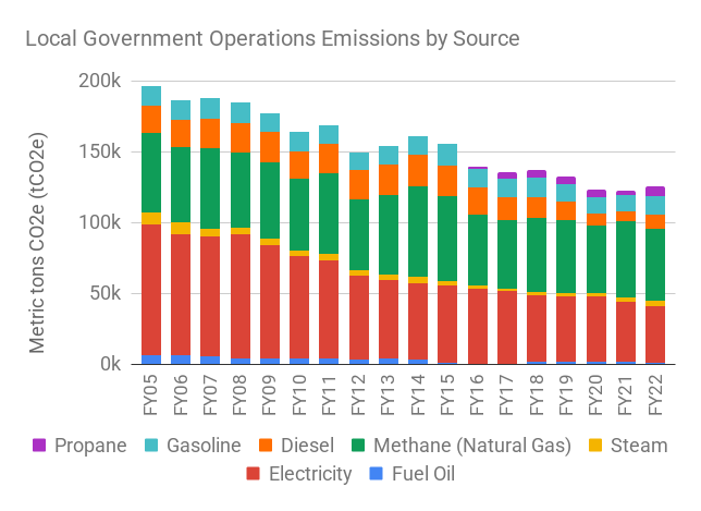 - The increase in FY22 emissions can be attributed to modest increase in energy usage across multiple sources, including vehicle fuels for City fleet (gasoline, diesel, and propane) and energy use in municipal buildings (electricity and natural gas).