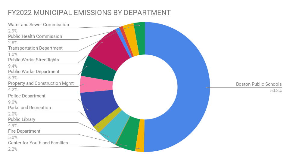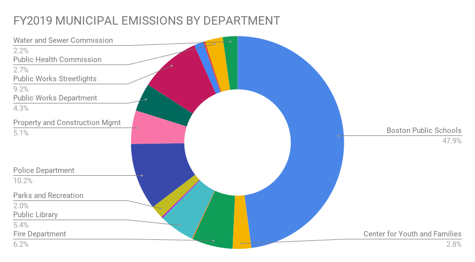 As the department with the largest building portfolio, and the second largest vehicle inventory (after Boston Police Department), Boston Public Schools (BPS) represents the largest source of municipal emissions. BPS owns and operates approximately 12 million of the City’s 16 million square feet of building space across the roughly 127 school buildings in the district. These buildings represent approximately one third of municipal electricity consumption and two thirds of municipal gas consumption.