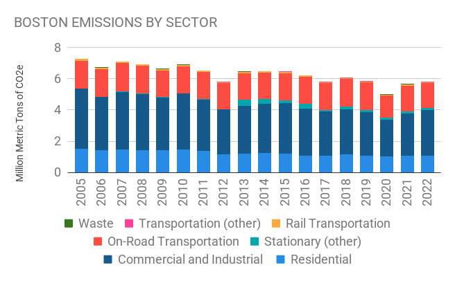 In 2022, the Boston community emitted 5.70 million metric tons of greenhouse gasses (GHGs) from energy use in buildings and transportation. This is nearly a 2.5% increase from 2021, when Boston emitted 5.59 million metric tons. This increase may largely be attributed to higher use of natural gas (also known as methane gas) in large buildings. Citywide emissions are reported by calendar year. The City of Boston has established an ambitious climate action agenda, aiming to achieve net-zero greenhouse gas emissions by the year 2050. As part of this long-term vision, the city has set an interim target of reducing citywide emissions 50% by 2030, relative to baseline levels.
