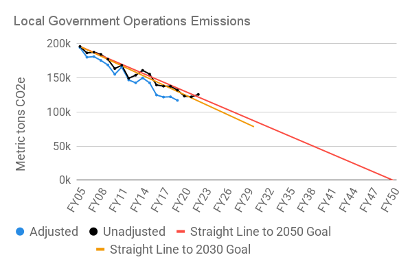 In FY22, municipal emissions increased by 6%, but are down more than 35% from 2005 before including adjustments for the purchase of renewable energy credits. Previously, the City of Boston had purchased Green-e certified RECS, but ceased the practice in 2019. In Fiscal Year 2023, the City evaluated options for a direct investment in renewable energy. The City of Boston is working toward its municipal goal of reducing greenhouse gas emissions by 60% by 2030.