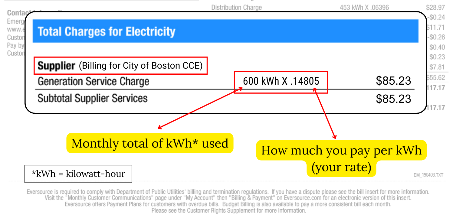 Your Eversource bill will list "Billing for City of Boston CCE" as the supplier. For a guide on how to find your electric supplier, click here.