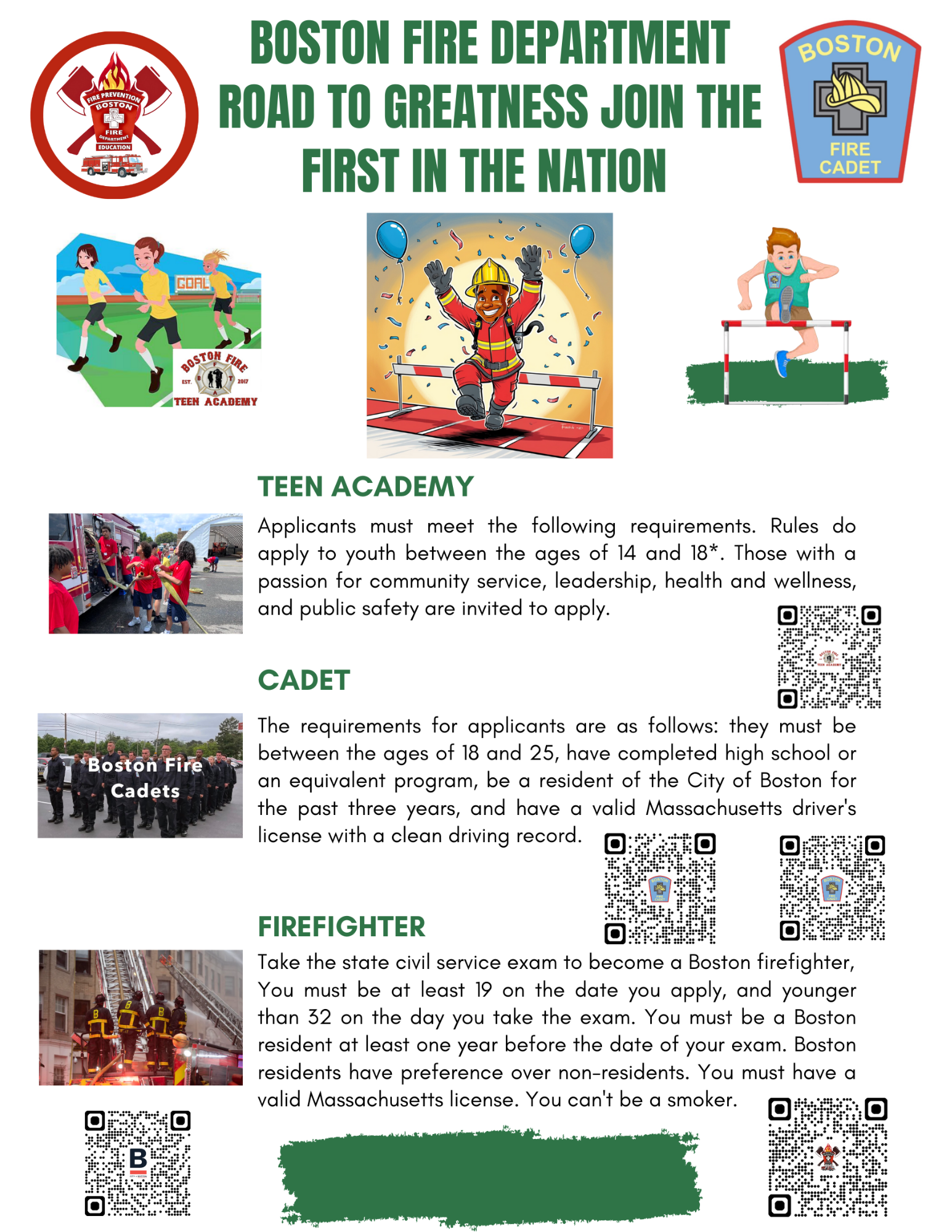 | Career Opportunities | The Boston Fire Department offers structured programs for young residents interested in pursuing careers in firefighting and public safety. Click here for more info |