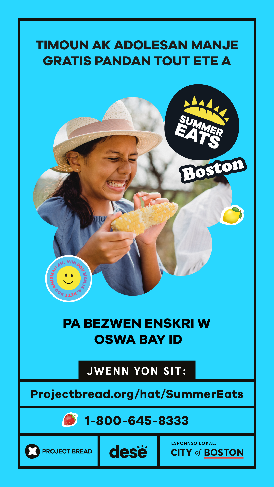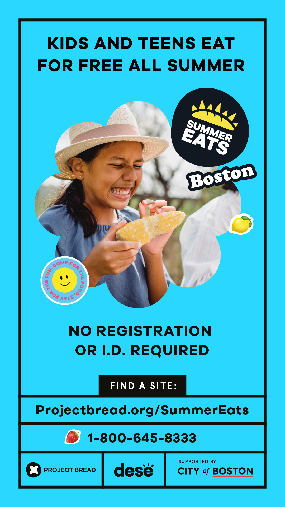 • Search the list above to find a Boston Summer Eats location near you, or click here to view a flyer with location details available in multiple languages. For a list of other Summer Eats sites throughout Massachusetts, visit Project Bread's Summer Eats webpage.