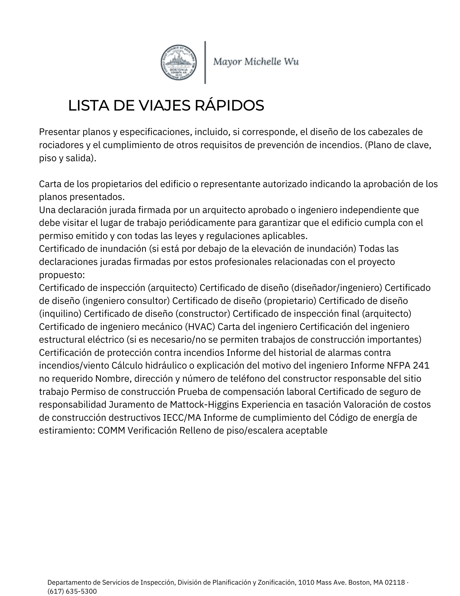 Applicants must submit electronic plans and specifications, including, if relevant, layout of sprinkler heads and compliance with other fire prevention requirements (key plan, floor and exits from space.)