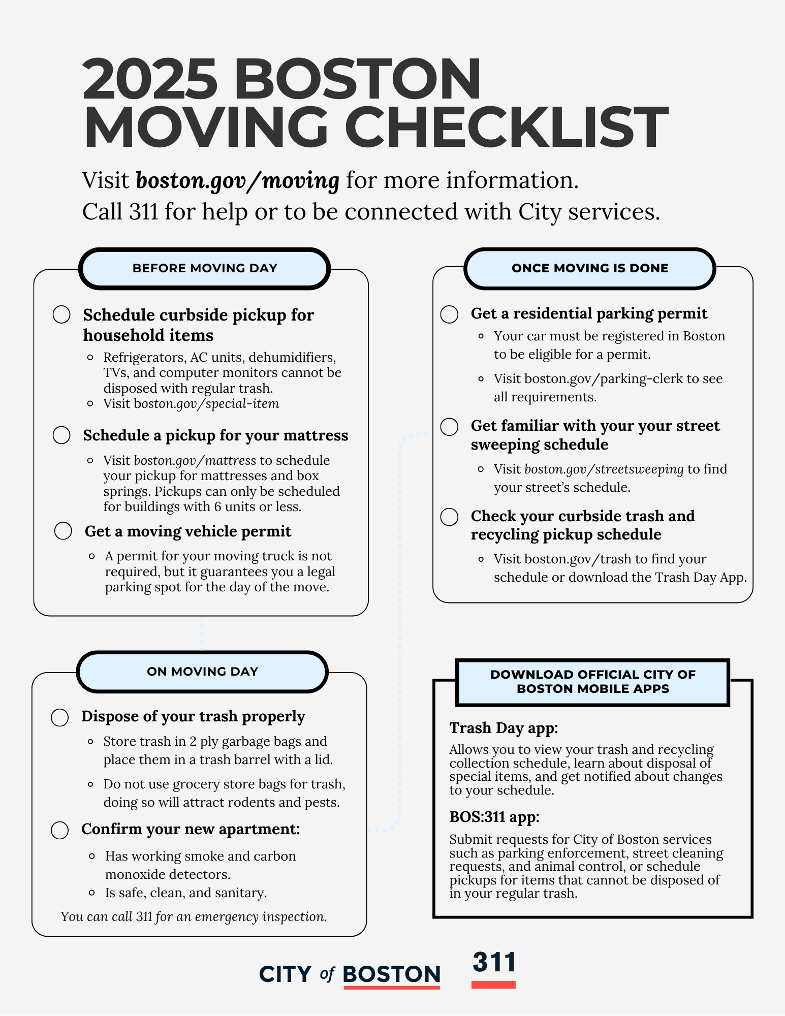 Whether you’re new to Boston or a longtime resident, our Constituent Services team is here to help. From answering your questions about inspections, permits, and safety regulations to connecting you with the right City department, we make navigating city services easy. Think of us as your friendly guide to getting things done in Boston.