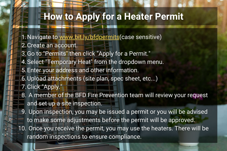 Heaters may be allowed on outdoor patios with approval from the Boston Fire Department and Inspectional Services Department with a Temporary Heater Permit. A permit is required for both private and public property. Applicants may apply on the Fire Prevention permitting portal. Click here to see how you can apply. Once the application intake and special hazard review are approved, an inspector from the Special Hazards Unit will conduct a site visit. All permits applied for online will be paid for online and the customer will be able to print their permit.