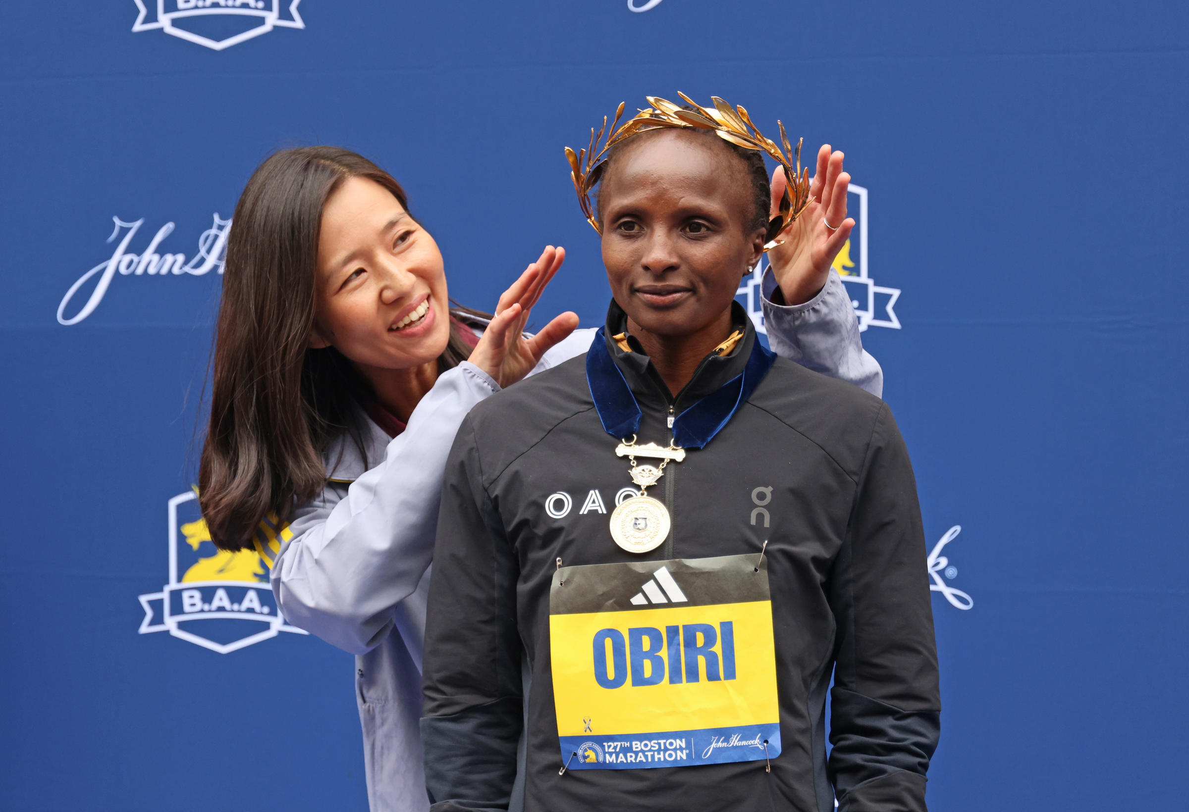 Mayor Wu crowns Hellen Obiri, winner of the 2023 Boston Marathon.
