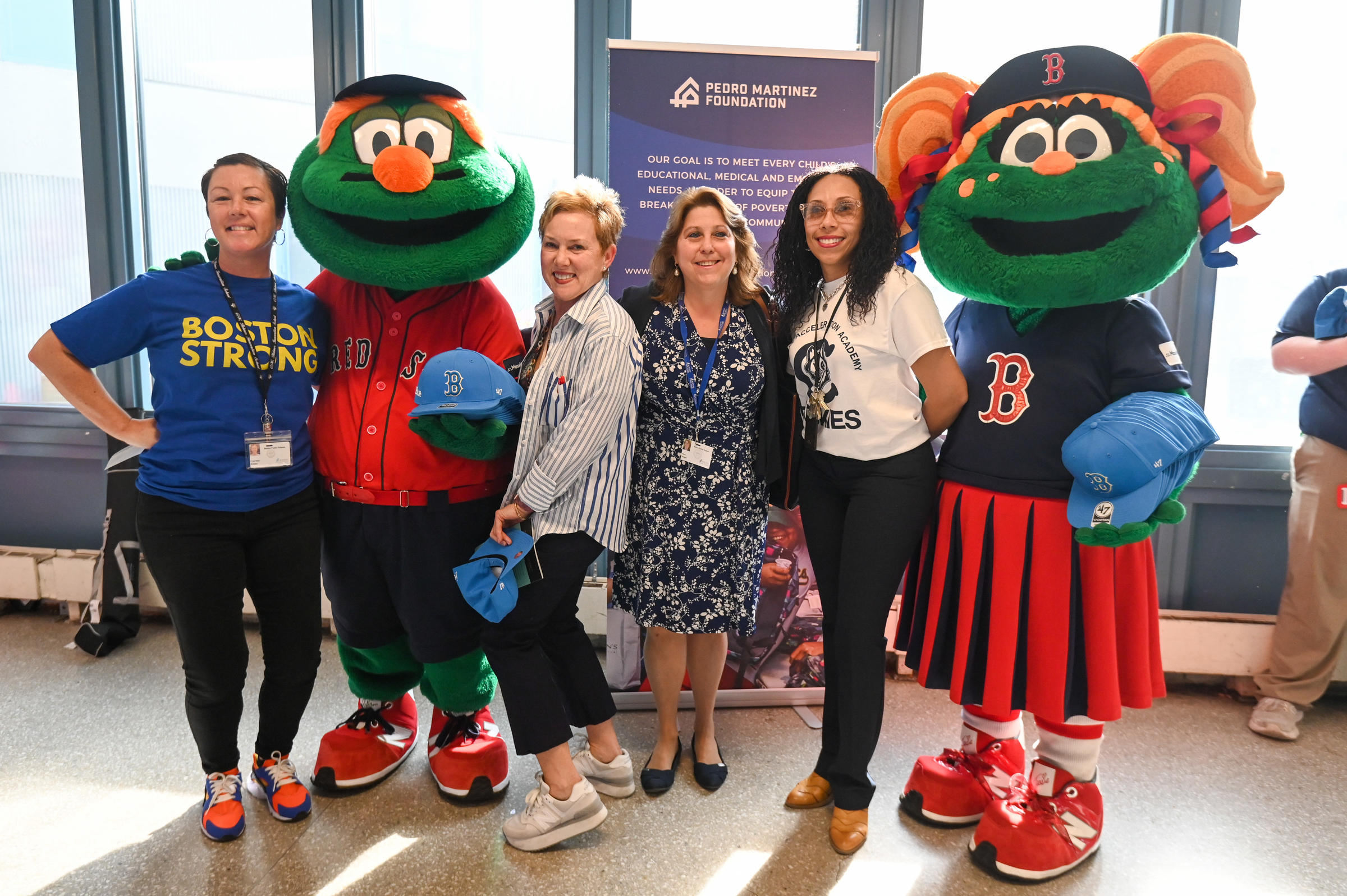 BPS Superintendent Mary Skipper and school staff pose with Red Sox mascots Wally and Tessie.