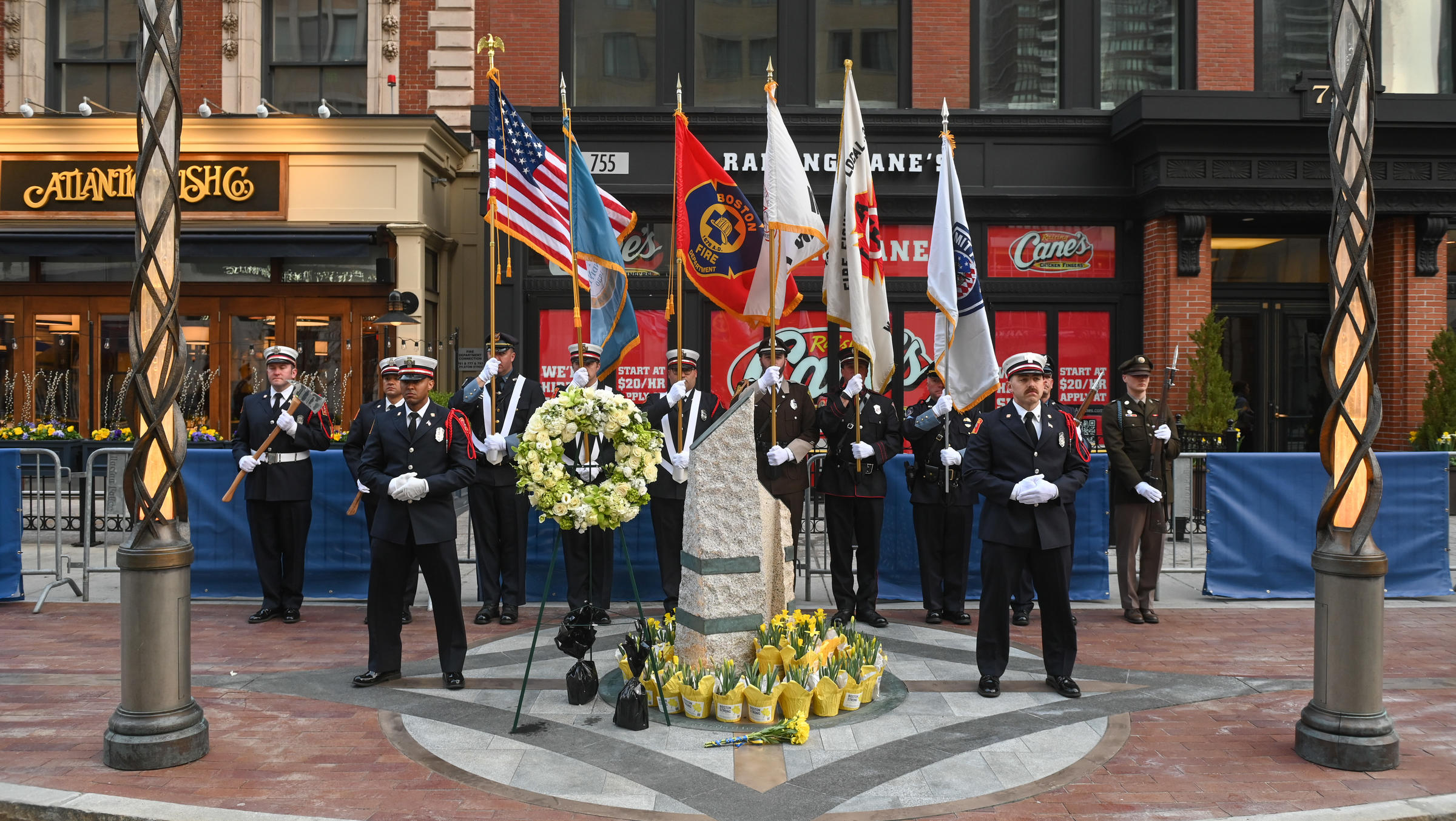A wreath and flowers are laid at the site of the 2013 Boston Marathon bombing, surrounded by Boston Fire members in uniform.