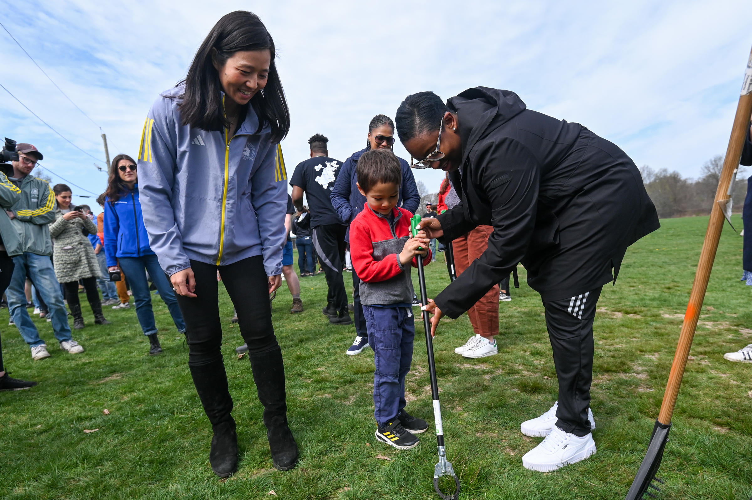 Mayor Wu and Chief of Community Engagement Brianna Millor help a young person at a clean up event.