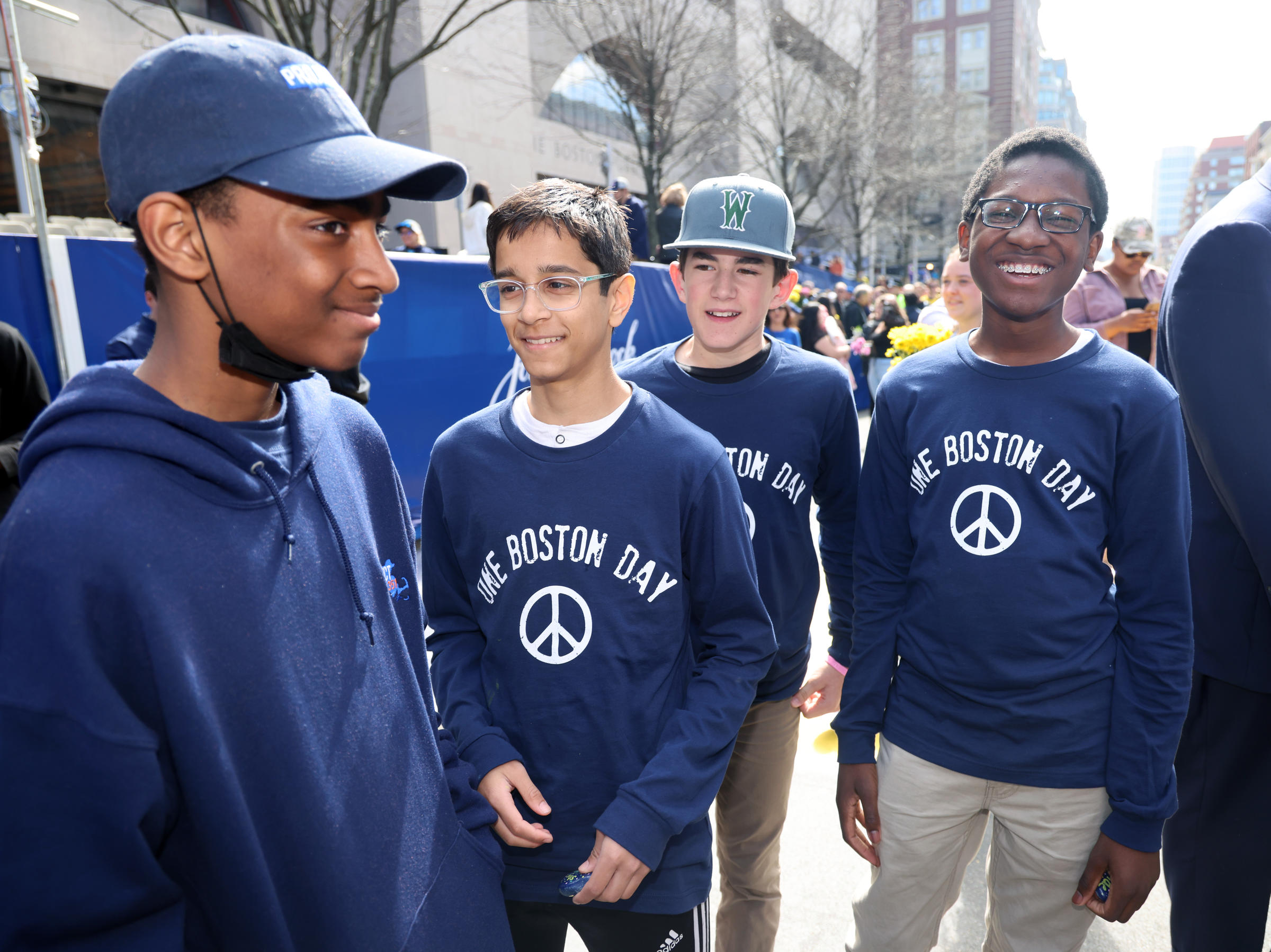 Young people at the Boston Marathon wearing their “One Boston Day” shirts.