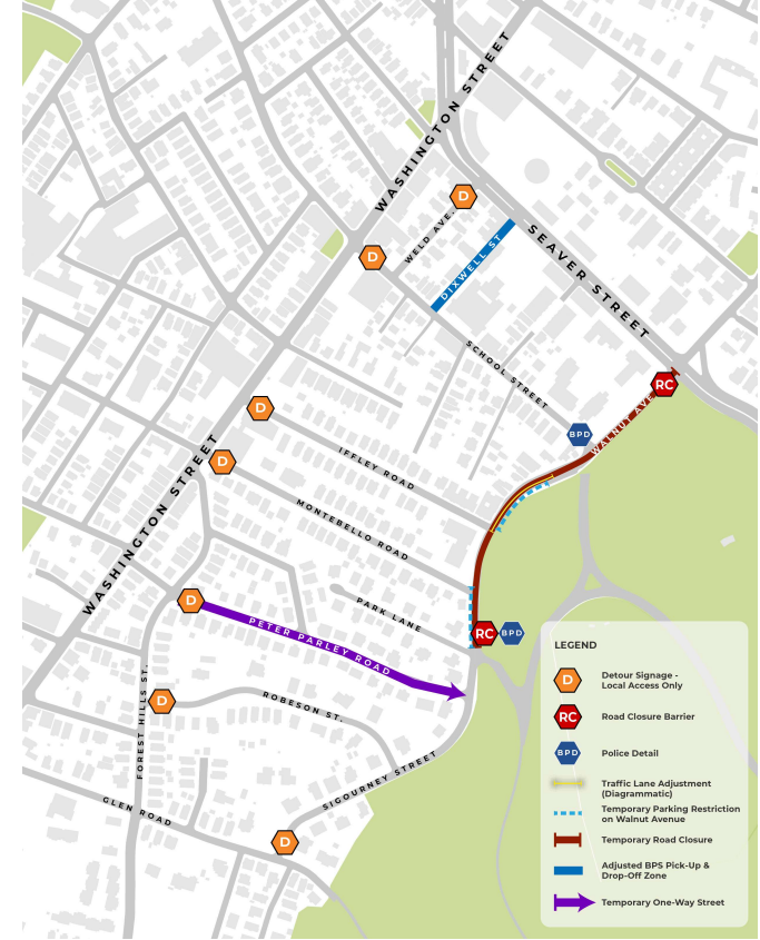 Temporary Street Closures: To accommodate heavier volumes of construction vehicles during the demolition phase, Walnut Ave between Park Lane and Seaver Street will be periodically restricted to local access and use only (including local residents and visitors, deliveries, school buses, and construction vehicles) and closed to through traffic. A barricade and police detail will be in place at Walnut Ave and School Street.