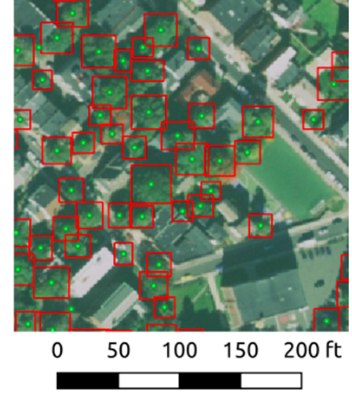 • The algorithm achieved 98% recall (with 89% precision) at a 10-foot tolerance, and 98% recall (with 92% precision) at a 20-foot tolerance. Recall, in our context, is simply whether the algorithm selected actual trees (the relevant items in our context) so that we can use the results reliably in conjunction with our municipal GIS.