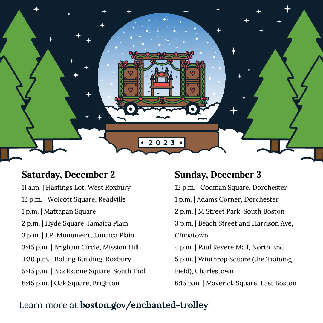 This year, the Mayor's Enchanted Trolley Tour will start on Saturday, December 6, and end on Sunday, December 7, in neighborhoods throughout Boston. ( *Please note that no one rides the trolley apart from working staff and the Christmas characters. )