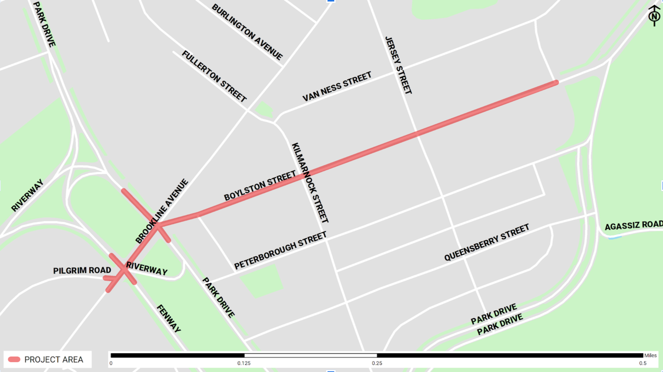 - Add new, protected bike lanes on Boylston Street. These bike lanes will connect to existing bike lanes on Brookline Avenue in the Longwood Medical Area, and to shared use paths on the Emerald Necklace.