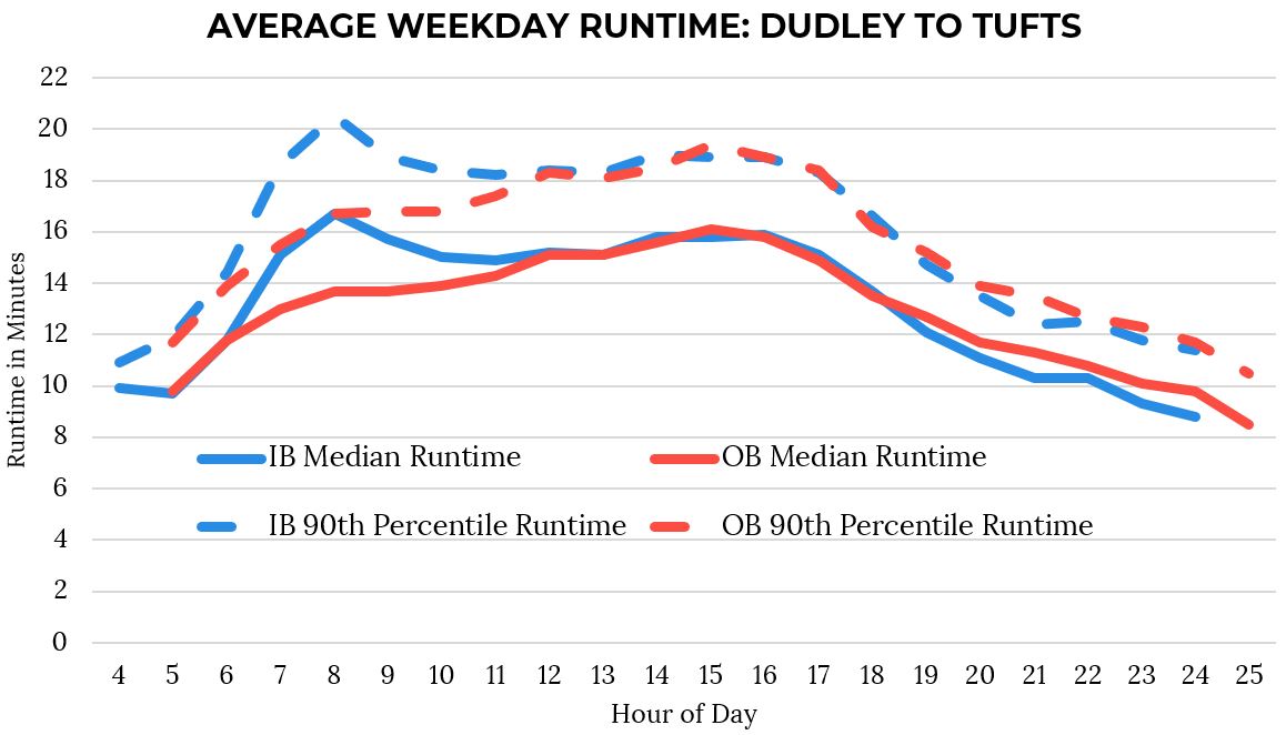 In addition to adding delay, disruptions to smooth transit operations introduce unpredictability. Trips between Dudley Station and Tufts Medical Center can be as quick as eight minutes, or as long as 20. Improvements to existing bus lanes on Washington Street can improve run times and reliability.