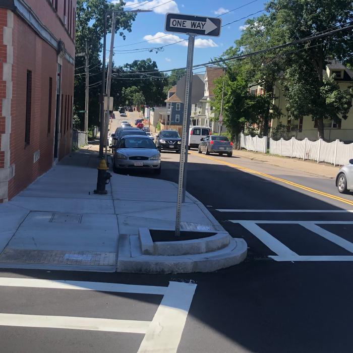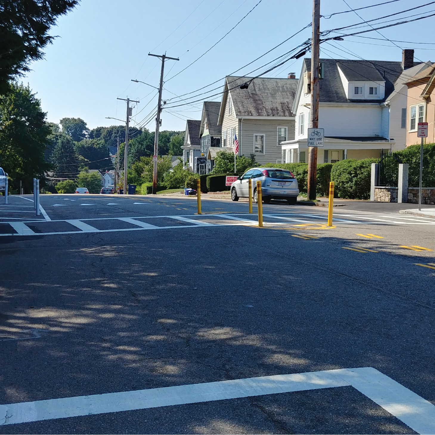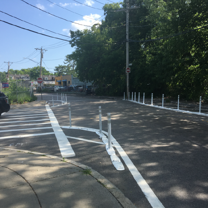 We can build curb extensions to fill in extra space at wide or irregularly-shaped intersections. We design the curb extensions to create a “T” in the intersection instead.