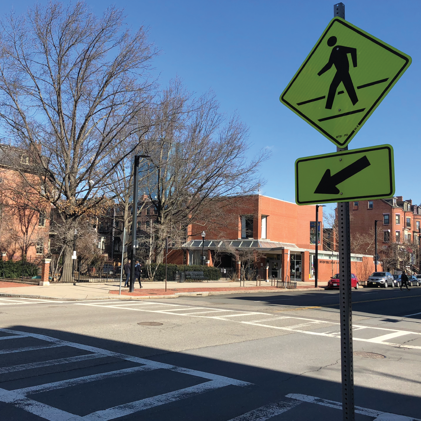 The most visible type of crosswalk looks like a ladder. This type of crosswalk has a row of thick white bars between two horizontal bars. All new crosswalks in the City of Boston are ladder-style crosswalks. We apply a reflective treatment to the white markings.