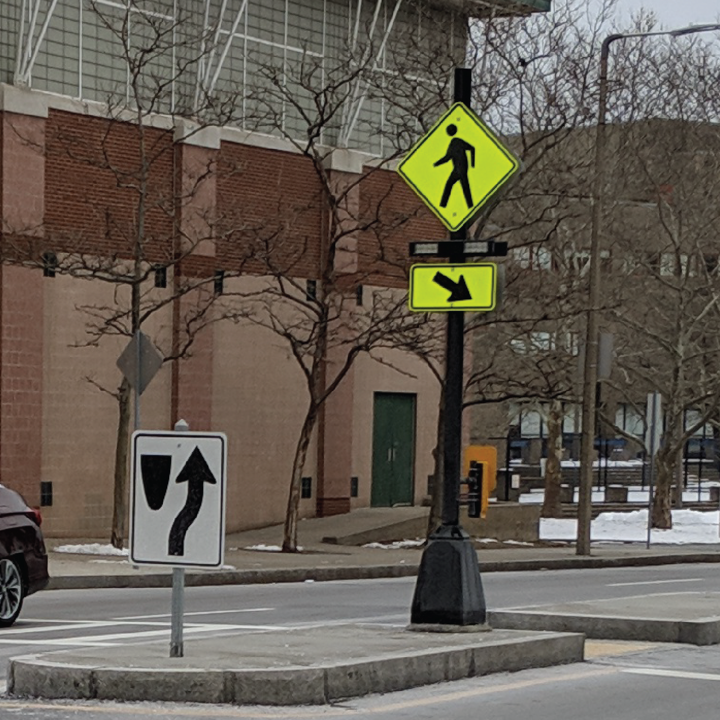 Pedestrian warning signs can be installed at unsignalized crosswalks. Often, the image of a person walking in a diamond shape is accompanied by a sign with an arrow pointing at the crosswalk.