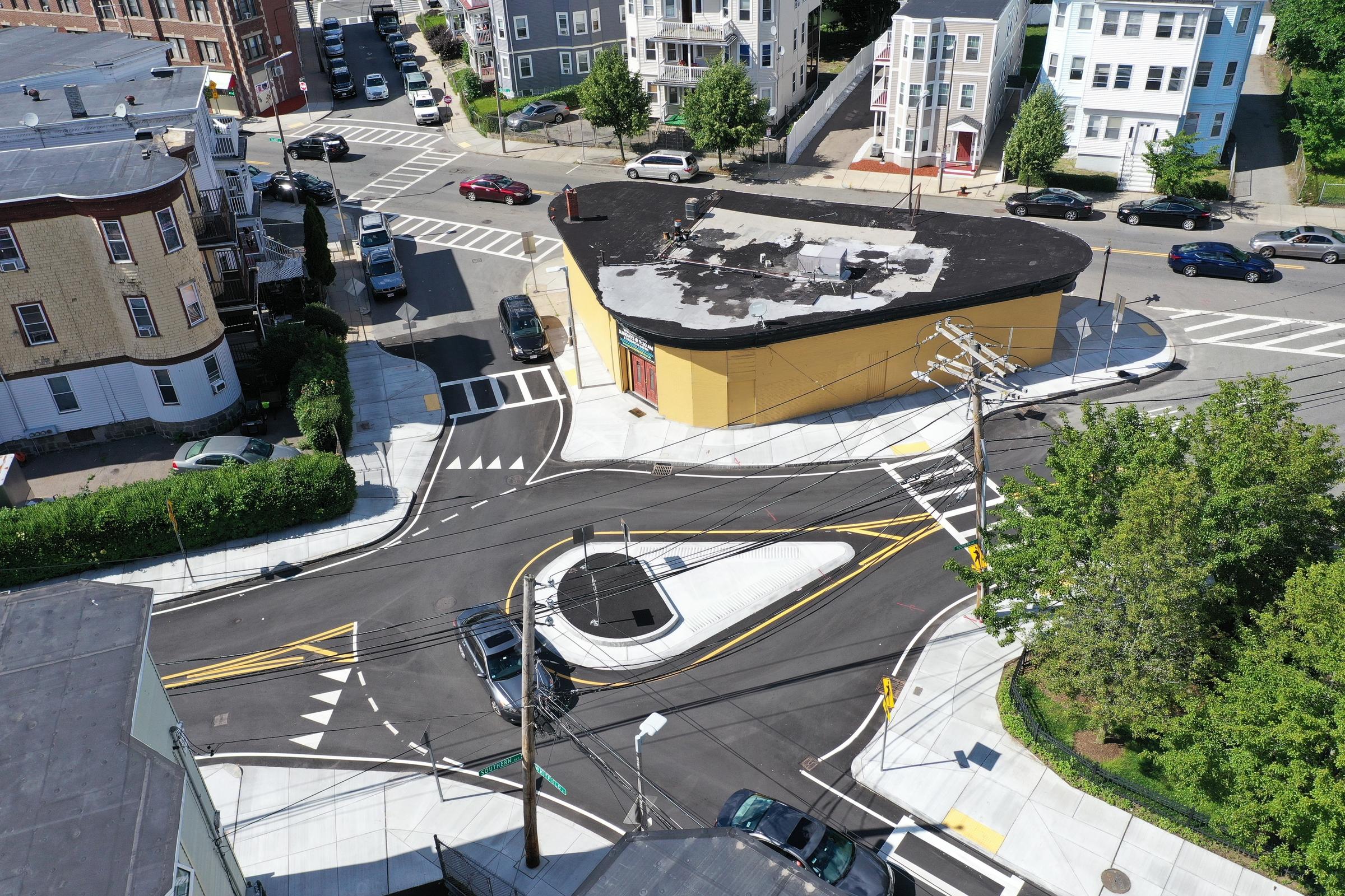 Roundabouts are a type of circular intersection. However, they are different from rotaries and traffic circles often seen in Boston and other New England cities. Roundabouts feature much smaller circles and are designed to promote slow entry and circulating driving speeds. Drivers do not need to change lanes as they move along the roundabout. Rotaries have much higher entry and circulating speeds. Changing lanes is often needed to complete certain movements.