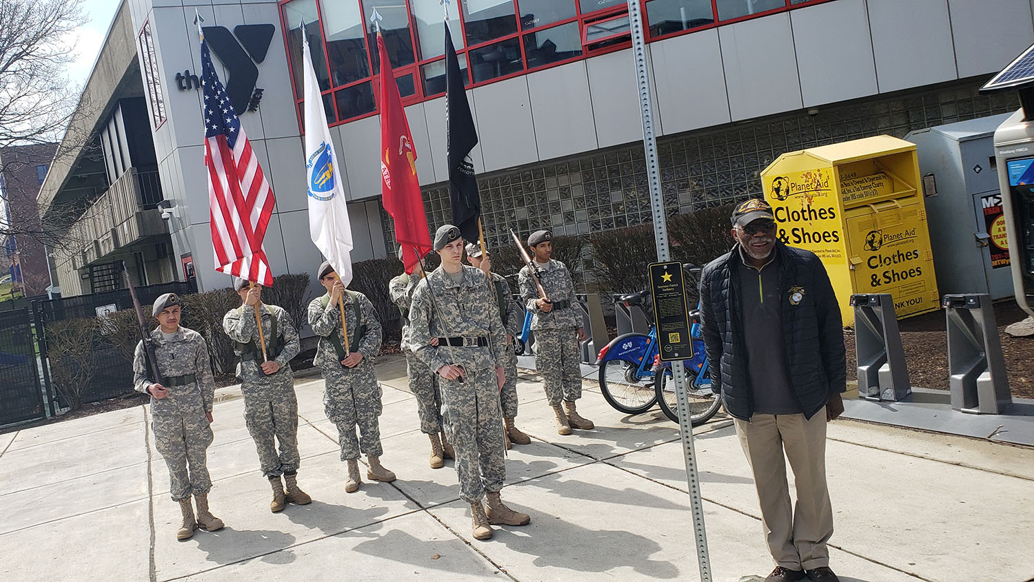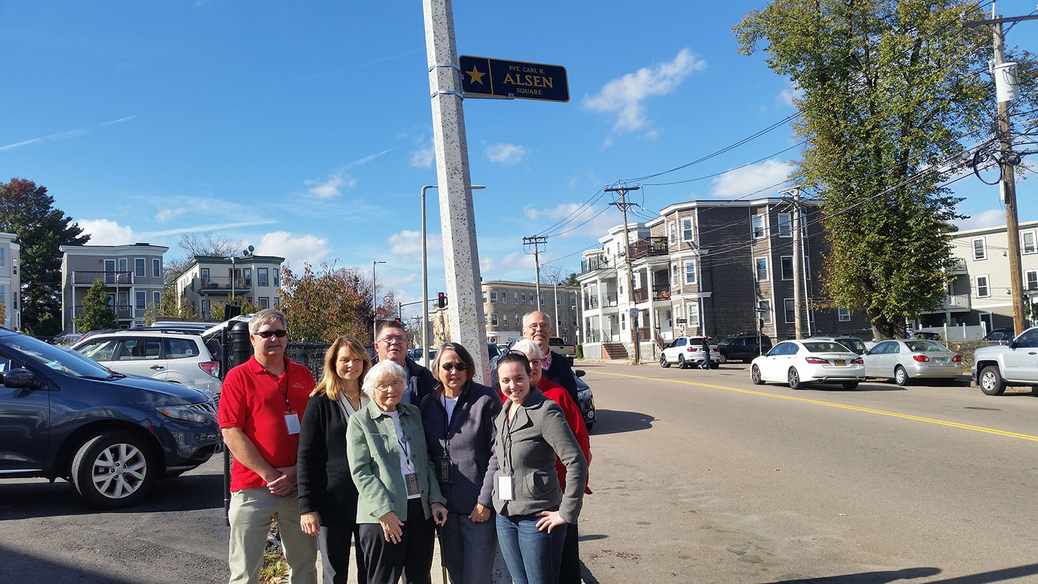 In 1898, the first Hero Square in Boston was named Dewey Square at South Station. Since then, we have dedicated more than 1,200 Hero Squares for service members killed in action. The gold star on each sign represents the ultimate sacrifice that was given. It is designated only for those killed in action.